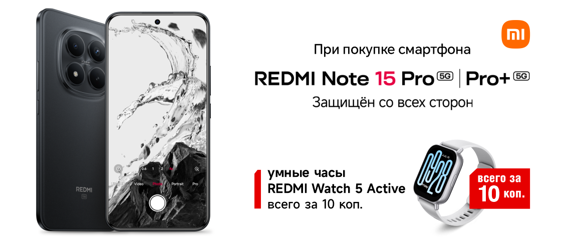 При покупке Xiaomi Redmi Note 15 Pro/Pro+ 5G умные часы за 10 коп.
