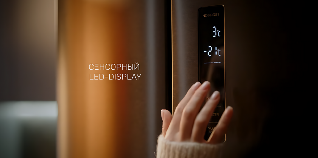 Сенсорное управление на электронном дисплее позволяет легко настраивать параметры холодильника, следить за температурой и активировать различные режимы, включая зону свежести для оптимального хранения овощей, мяса/рыбы и фруктов. Режим отпуска снижает энергопотребление в период отсутствия пользователей.