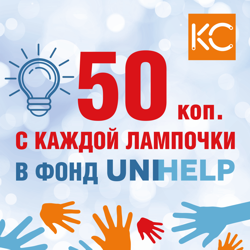 В декабре торговая сеть «ЭЛЕКТРОСИЛА» перечислит 50 копеек c каждой проданной лампочки КС в международную благотворительную организацию UNIHELP. Таким образом, приобретая лампочку КС, которая долгое время будет светить в вашем доме, вы помогаете детям, которые так ждут нашей помощи. Это может быть важная операция, которая изменит жизнь ребёнка. Или специальное кресло, которое поможет взглянуть на мир по-новому.