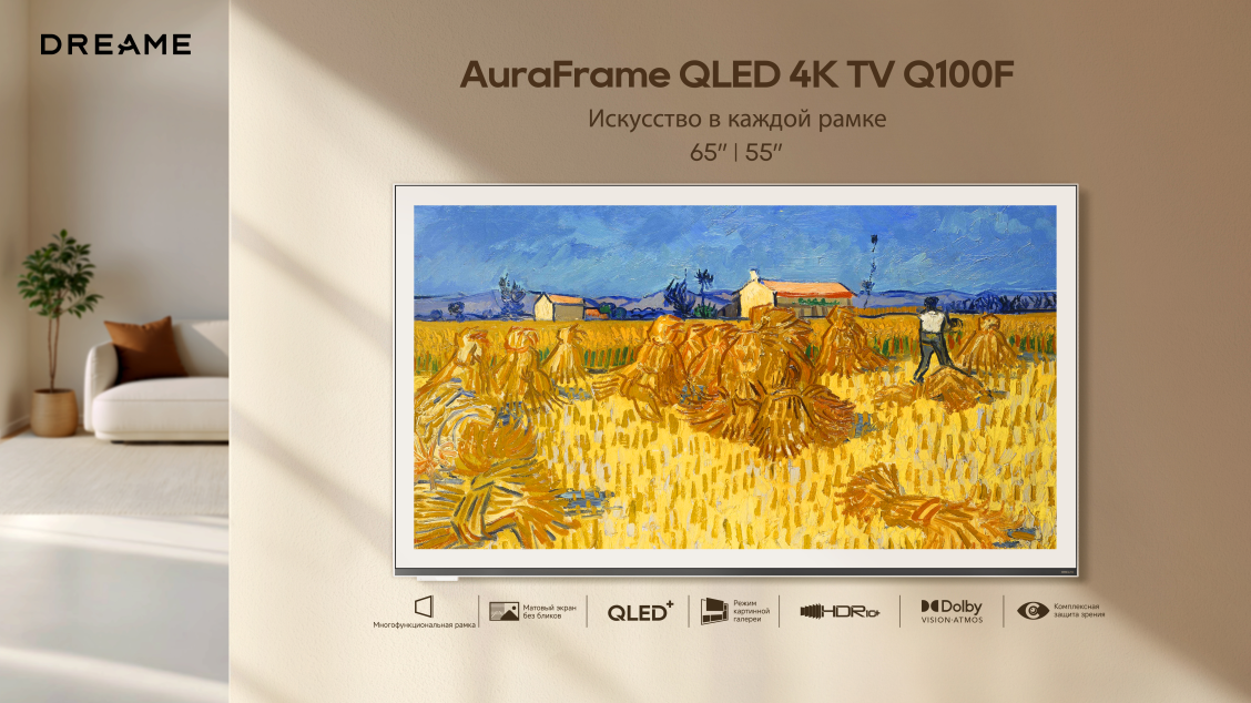 Телевизор DREAME AuraFrame QLED 4K TV Q100F — это настоящий арт-объект для вашей гостиной. Благодаря своему минималистичному дизайну с ультратонкой рамкой и стильной задней панелью телевизор органично впишется в ваш интерьер. Матовый антибликовый экран с технологией QLED+ отвечают за сочное, детализированное изображение с точной цветопередачей даже при ярком свете. А одна из главных фишек телевизора — режим Art Time, который превращает экран в персональную галерею. Также есть встроенный Google TV и голосовое управление, за счёт чего управлять телевизором просто и комфортно.