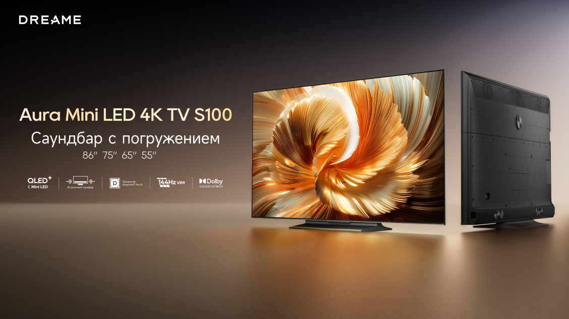 Телевизоры DREAME Aura Mini LED S100 гарантируют вам кинематографический опыт благодаря мощной комбинации технологий. За яркую и контрастную картинку отвечают технологии QLED+ и Mini LED. Объёмный и насыщенный звук создаётся встроенным саундбаром с поддержкой Dolby Atmos, избавляя вас от необходимости покупать дополнительные колонки. За плавность динамичных сцен и игровую графику отвечает высокая частота обновления 144Hz VRR. Интеллектуальный процессор Dreamind™ Pro AI автоматически оптимизирует каждую деталь изображения и звука.